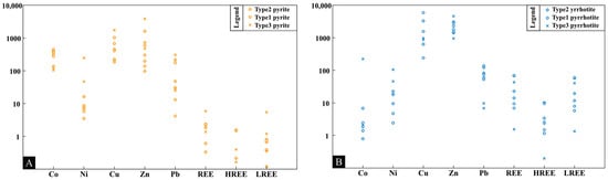 In Type-1 massive ores, pyrrhotite has an average content of Ni = 8.443 ppm, Zn = 2367 ppm, and Cu = 2562 ppm, and is enriched in rare earth elements (REEs), with an average REE of 28.030 ppm and a (La:Yb)N ratio of 14.434 (Figure 4B). The average contents of Co and Pb in pyrrhotite are 1.274 ppm and 85.733 ppm, respectively. In these Type-1 massive ores, pyrrhotite has a wider range of S values, from 0.1‰ to 4.2‰.