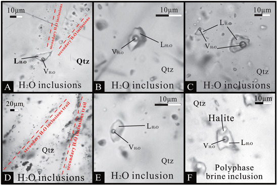 (A) Primary and secondary fluid inclusions in the quartz of Type-1 massive ores. (B) Primary fluid inclusions in the quartz of Type-1 massive ores. (C) Primary fluid inclusions in the quartz of Type-2 massive ores. (D) Secondary fluid inclusions in the quartz of Type-1 massive ores. (E) Primary fluid inclusions in the quartz of Type-3 massive ores. (F) Halite-bearing fluid inclusions in the quartz of Type-3 massive ores.