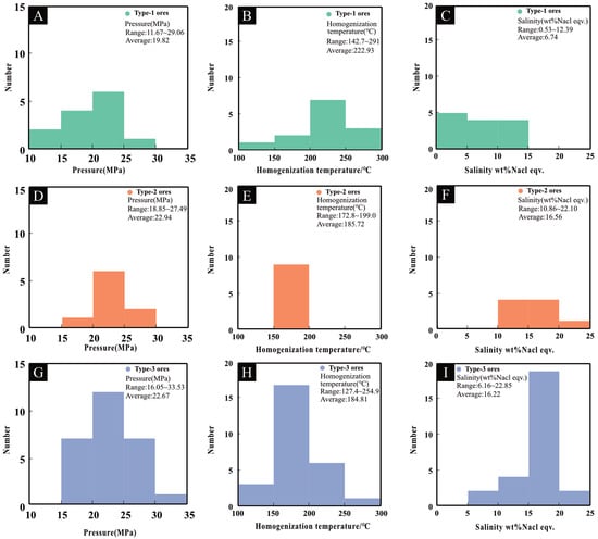 Type-1 ore fluid inclusions have homogenization temperatures (Th) ranging from 142.7 °C to 291 °C, with salinities varying from 0.18 to 12.39 wt.% NaCl eqv. The majority of these inclusions have Th values between 200 °C and 250 °C, and salinities lower than 10 wt.% NaCl eqv. (Figure 6B,C).