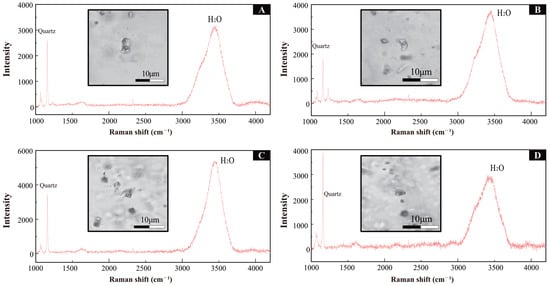 The representative fluid inclusions in quartz were measured using RM2000 Raman microprobe red (Renishaw, UK) to constrain their gas compositions. The analyses of both inclusions of quartz from massive and dissminated ores show a broad band with a maximum of around 3450 cm−1 (Figure 7A). It is concluded that H2O is the dominant component of fluid inclusion from the Hongtoushan deposit ores.