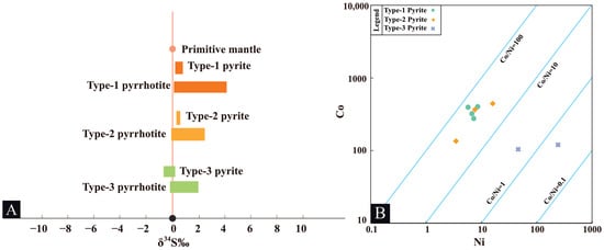 (A) Sulfur isotopic compositions of sulfides from the Hongtoushan deposit; (B) Co-Ni ratio relationship diagram.