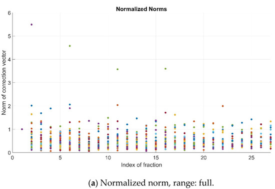 Normalized norms (N) for all patients and fractions—full range (a), range 0–1 (b) and range > 1 (c). Color dots represent the values corresponding to the different patients’ fractions.