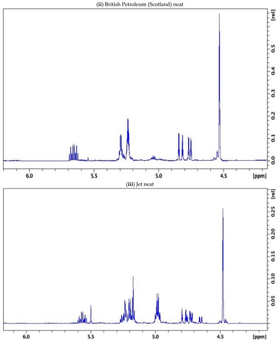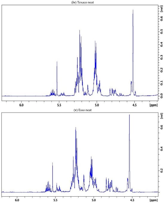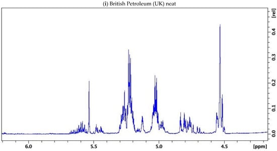 Representation of the olefin region of the 1H NMR spectra of neat petrol from different sources: (i) British Petroleum Scotland, (ii) British Petroleum UK, (iii) Jet (Concord), (iv) Texaco, (v) Esso and (vi) Shell.