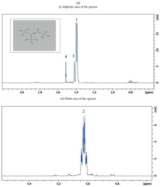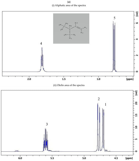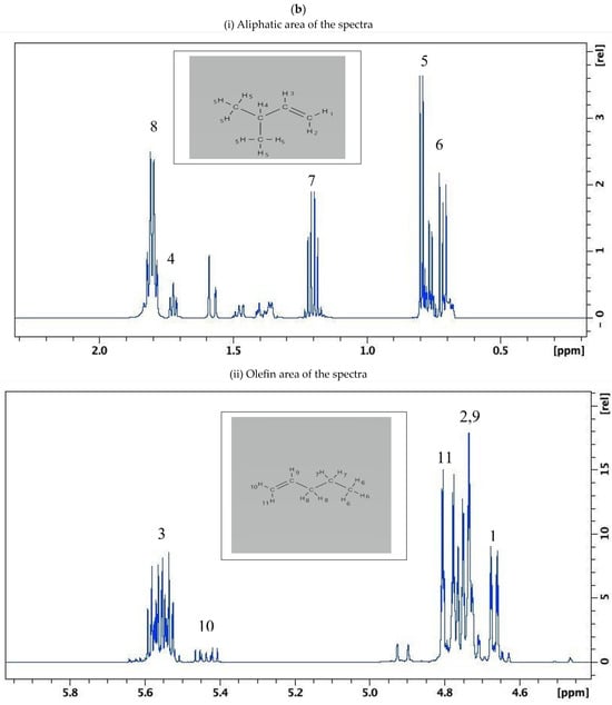 The datasets underwent unsupervised machine learning by applying PCA and a supervised analysis by applying PLS-DA in MetaboAnalyst. PCA was chosen as the explorative tool of the pre-processed data to display any natural groupings. The score plots were a visual representation of the clustering between groups. A loading plot displays how strongly each characteristic influences a principal component. Therefore, PLS-DA was then used for the classification and feature selection of the variables, using cross-validation to select an optimal number of components for classification. The bins that contained important variable information for classification were identified by PLS-DA through the Variation Importance Projection (VIP) score. The VIP score is a measure of a variable’s importance in the PLS-DA model [21]. It summarizes the contribution a variable makes to the model. The VIP score of a variable is calculated as a weighted sum of the squared correlations between the PLS-DA components and the original variable. A statistical analysis was performed exploiting the real-time interactive web-based application MetaboAnalyst. Firstly, the non-targeting approach, considering all the spectral information, was explored for classification purposes, and then the targeting approach was used, where the four sets of olefins were evaluated to achieve better clustering. The dataset from the 1H selTOCSY spectral data was used, which edited out many NMR peaks by filtering out all signals that did not have a component of their spin system in the selective excitation.