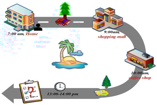 It is important to note that users’ behaviors are not only influenced by their historical preferences but also by their real-time preferences and time constraints. For example, Figure 1 illustrates that the user left home at 7:00 a.m., went shopping at 9:00 a.m., and then visited a cafe. When recommending the next point of interest (POI) to the user between 1:00 p.m. and 2:00 p.m., it is important to consider their real-time needs and preferences. Therefore, the user’s trajectory should be used to mine their preferences at a specific time period for real-time POI recommendations. However, applying these trajectories to real-time POI recommendations is not simple due to two issues. Firstly, the time series is unstructured in terms of users’ trajectories. Users have irregular time intervals between visits to different POIs, or they visit different POIs for inconsistent lengths of time in different time periods. This situation may be caused by the user’s personal habits, practical needs, or environment, which makes it difficult for structured models to extract relevant temporal features. Additionally, the harvest data from LBSNs often contain information about the regions and categories to which the POIs belong []. The utilization of these features is insufficient in most commonly used POI recommendation engines, thereby limiting further improvements in the performances of these models.