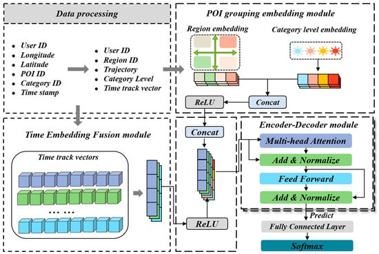 This section describes the structure of the proposed AST-PG model. As shown in Figure 2, the model consists of four modules: the time-embedding module, POI-group-embedding module, encoding–decoding module, and prediction module.