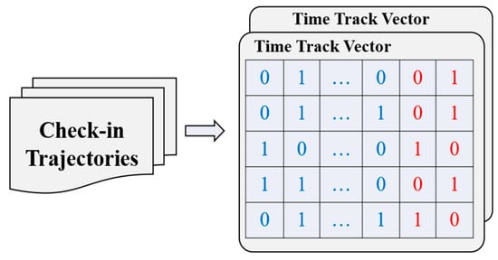 To further improve the accuracy of the time embedding, we add two dimensions after the 48-dimensional time track vector to indicate whether the track occurs mainly on weekdays or weekends. First, we iterate through all check-in events and count the number of check-ins on weekdays and weekends separately. If the number of weekday check-ins is more than half of the total number of check-ins in the trajectory, the first extra dimension (weekday dimension) should be set to 1; otherwise, it should be set to 0. Similarly, if the number of weekend check-ins is more than half of the total number of check-ins in the trajectory, the second extra dimension (weekend dimension) should be set to 1; otherwise, it should be set to 0. Figure 3 illustrates an example of temporal-data mapping. With this approach, we construct a 50-dimensional final trajectory vector that contains information about the temporal distribution and global information about whether the trajectory mainly occurs on weekdays or weekends.