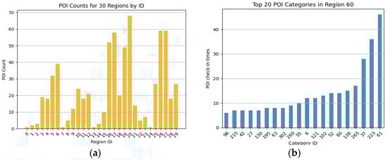 To provide more insight into the importance of grouping POIs based on the region and category hierarchy, we are aided by two charts. Figure 4a shows in detail the distribution of the numbers of POIs across the 30 regions. It is evident from the chart that there are significant differences in the numbers of POIs in different regions. For example, the region with ID 20 tends to have many POI check-ins due to intensive user activity, while the region with ID 24 has relatively few. This distribution pattern reflects the degree of prosperity and user activity in different regions, which is essential for POI grouping. Figure 4b reveals the distribution of the numbers of POIs in different category classes within a given area. The category rank is calculated based on the ratio of the frequency of user check-ins in that category to the total number of check-ins. We can see from the chart that even within the same region, POIs in different categories may have different category ranks.