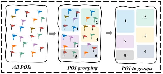 Accordingly, this study developed a geo-categorical-based POI-group-embedding module, which uses the embedding vectors of the regions and categories to which the target POI belongs to represent the spatial features. Figure 5 below illustrates the grouping process of the POIs. The POIs are divided into different geographic regions and graded according to the characteristics of their categories in each region. This helps to understand the interest in and importance of the different categories of POIs in each region in a more effective way. The grading is based on the obvious quantitative differences in the categories of POIs in each region. In short, with this grouping approach, we can better capture the attributes of these POIs and the access patterns of users to them. Even POIs that are accessed less frequently, as long as they represent a certain domain region and category rank value, will still be included in the corresponding POI group and have a chance to be recommended to the target users. Our prediction task is to predict the probability of a target user visiting a specific group from the POI-group level to generate the final POI recommendation list. This method not only improves the prediction efficiency but also improves the recommendation accuracy by aggregating similar POIs. At the same time, infrequently visited POIs may have higher representation in some specific POI groups, and thus they also have a chance to be prioritized higher in the recommendation list. We model spatial features using POI groups that consist of region and category features.