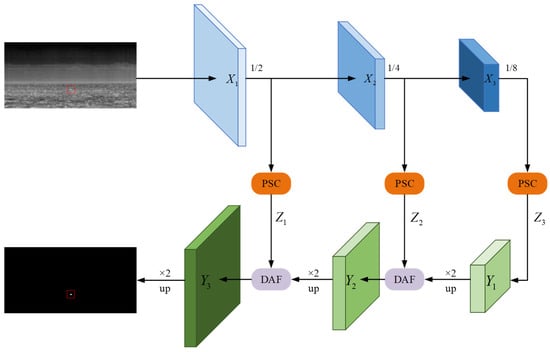 Figure 1 illustrates the overall architecture of the proposed infrared multi-scale small-target detection model. In the first step, the image that contains an infrared multi-scale small target is processed using a deep convolutional neural network, and feature maps of 1/2, 1/4, and 1/8 of the original image are obtained. The feature maps from various stages of feature extraction are processed by the PSC module. Then, the feature map generated by the PSC module in each stage is upsampled by a factor of 2 and fused with the feature map obtained in the previous stage with the PSC module to extract the portion that encapsulates information crucial for small-target identification. The fusion is performed with a DAF module. After two fusions, the final fused feature map is used to segment the small target, resulting in the acquisition of the small target in an infrared image.