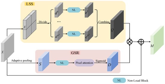 The global semantic correlation module is shown in the lower part of Figure 3. It is used to estimate the levels of dependency among blocks and will be referred to as GSR. For feature map , obtained through feature extraction at a given scale , is processed by adaptive pooling to obtain a feature map of size . Each point in set corresponds to the feature block at the corresponding position in the LSS module. The non-local block then estimates the similarity between each position in and all other positions, capturing long-range dependencies by estimating the correlation between each block in feature map . Afterward, the obtained features are input into the pixel attention module. This module adjusts the weight of each pixel dynamically, highlighting important pixel regions and suppressing unimportant ones, thus enhancing the representation ability of pixel-level features. Finally, the feature map is obtained by the sigmoid function, and the operations performed in the process are described by Equations (3)–(5):