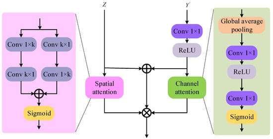 The low-level features and high-level features represent different semantic information. The high-level features are obtained from in Figure 1 after two rounds of upsampling operations. The low-level features contain the location information of multiple small targets, and the spatial attention mechanism module can be used to process the local location information. The high-level features can utilize the channel attention mechanism module to process channel semantic information, prioritizing the semantic expression of different channels. The low-level features and high-level features are incorporated together and fused with the low-level features constrained by spatial attention and the high-level features constrained by channel attention, respectively, as shown in Equation (7):