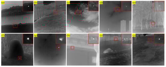The IRSTD-1k [] dataset; (a–j) are examples of images in the dataset.