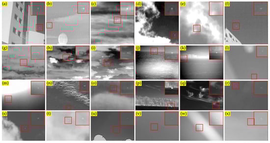 The SIRST [] dataset; (a–x) are examples of images in the dataset.