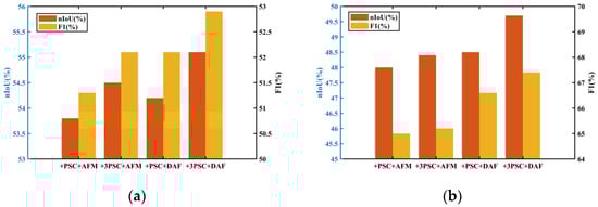 Compared with the original FPN [], the PSC module and DAF module were added based on it, with both modules being added simultaneously. Experiments are carried out on two datasets: IRSTD-1k and SIRST. The nIoU and F1 scores obtained from the experiment are displayed in Figure 7. Here, “None” refers to the original FPN network, “+PSC” denotes the addition of the PSC module to the original FPN network, “+DAF” indicates the integration of the DAF module into the original FPN network, and “+PSC + DAF” represents the inclusion of both modules.