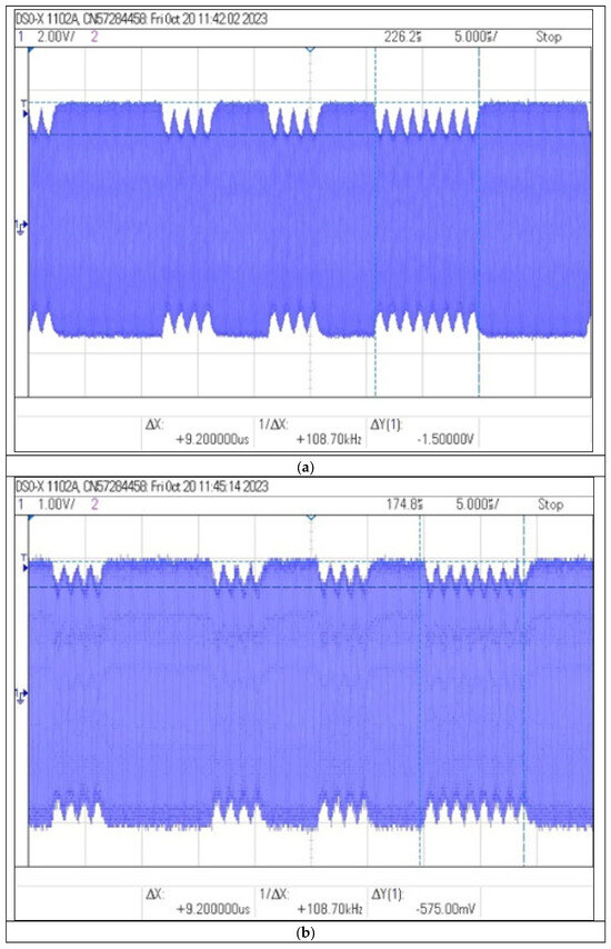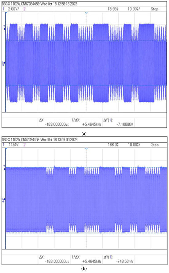 The obtained values of and and the values of the modulation depth factor determined on their basis are presented in Table 3, while exemplary images recorded by the oscilloscope are shown in Figure 12.