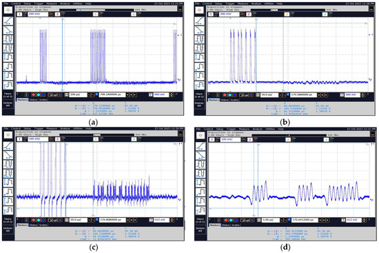 During the tests, the ID card was placed at a distance of 3 cm from the reader. The coil and capacitor were placed at different distances from the identifier and on the basis of the obtained oscillograms the modulation depth factor and the signal level were determined as a function of the distance of the coil from the identifier. The values of and read using the oscilloscope and the calculated values of the modulation depth factor m are shown in Table 5, while examples of images recorded by the oscilloscope are shown in Figure 17.
