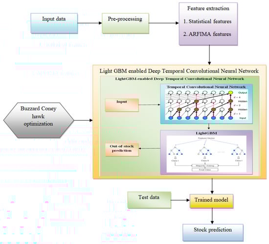 The main focus of this research is developing a novel out-of-stock prediction system that combines deep learning techniques with historical data analysis. This process entails the collection of data from the input dataset [] and the subsequent preprocessing of this data for it to be ready and organized for analysis. Next, feature extraction is conducted, which involves using both statistical features and Autoregressive Fractionally Integrated Moving-Average (ARFIMA) features that combine to give a holistic image of the nature of the data. The LightGBM-enabled deep temporal CNN receives these extracted features as input. The LightGBM-based deep temporal CNN helps to modify the classifier to improve both accuracy and speed. Incorporating BCHO with a deep temporal CNN efficiently identifies temporal patterns in stock market data, enabling a more thorough analysis of market trends. Moreover, working with LightGBM allows the model to effectively handle large datasets and sparse data labels. With this integrated approach, the model intends to offer more precise and dependable predictions through proactive stock management techniques, ultimately overcoming the obstacles of stock market forecasting. To make sure that the model becomes faster and even more precise, a unique strategy is applied whereby the classifier is fine-tuned using the Buzzard Coney Hawk Optimization algorithm. This optimization strategy is specifically developed by assembling the features of vultures [], rabbits [], and Harris hawks [], which produce a strong computational optimization agent. When the model is finely tuned, it is then trained using the existing dataset and finally tested against new data to determine its accuracy and predictive capabilities. This whole process finally helps to predict stocks in an accurate way, which makes proactive stock management possible in order to prevent or minimize out-of-stock circumstances. The architecture of the proposed out-of-stock prediction model is shown in Figure 1.