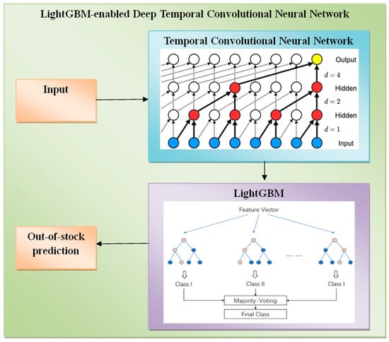 The concatenated feature extraction output forms the input for the out-of-stock prediction model. The deep temporal CNN, which has been designed to support time-series data, visualizes the temporal conditions of the data through causal convolution and dilation, and is thus able to capture long-term dependencies without the leakage of future information. In this way, the entire process aims to provide feedback on these features in the form of temporal patterns and trends in the LightGBM model. LightGBM, which is a powerful platform with high efficiency and accuracy, fine-tunes the feature representations and predicts the occurrence possibility of out-of-stock situations based on the extracted features. This hybrid approach integrates the strengths of deep learning techniques with those of the gradient boosting method, which helps to preserve reliability and accuracy in prediction, and leads to a proactive stock management strategy aimed at preventing or reducing out-of-stock situations.