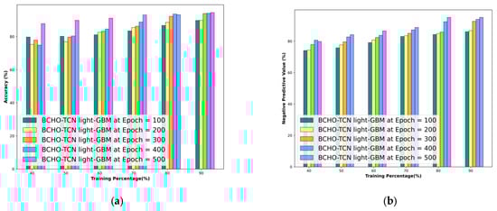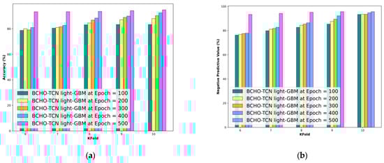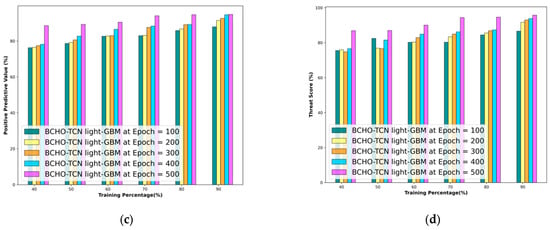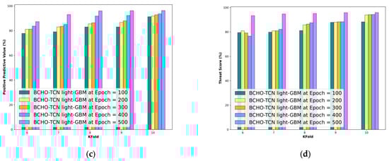 Figure 5 showcases the results of the BCHO-TCN LightGBM model for predicting out-of-stock occurrences. Figure 5a shows that the accuracy increases with each epoch value, with percentages of 83.35%, 88.01%, 90.26%, 92.51%, and 94.81% for epochs of 100, 200, 300, 400, and 500, respectively, using a 10-fold method. Likewise, Figure 5b displays the outcomes of the BCHO-TCN Light GBM model for NPV with a k-fold of 10, with values of 93.34%, 93.48%, 93.49%, 94.76%, and 95.60%. The results shown in Figure 5c for the epoch values of 100, 200, 300, 400, and 500 are 91.29%, 91.76%, 92.86%, 93.63%, and 96.28% for PDV at a k-fold of 10. Similarly, Figure 5d illustrates the findings of the BCHO-TCN LightGBM model in terms of threat score with a k-fold of 10, with values of 88.25%, 93.93%, 94.14%, 94.34%, and 95.86%.