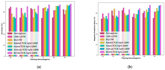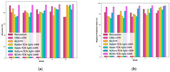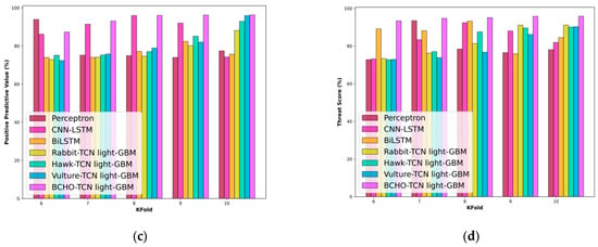 Figure 7a–d show the comparative analysis based on k-fold for accuracy, NPV, PDV, and threat score. The BCHO-TCN LightGBM model demonstrates superior accuracy in predicting out-of-stock events, with a 10.09% improvement over the vulture-TCN LightGBM model, achieving an accuracy of 94.81%.
