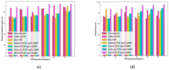Figure 6a–d show the comparative analysis based on TP for accuracy, NPV, PDV, and threat score. The BCHO-TCN LightGBM model demonstrates superior accuracy in predicting out-of-stock events, with a 2.13% improvement over the vulture-TCN LightGBM model, achieving an accuracy of 94.52%.