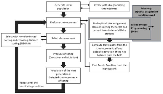 An HGA is proposed to address the PDVRP in this study, which combines GA and MIP techniques. The overall algorithm is illustrated in Figure 1. The GA generates and updates the feasible paths (chromosomes) for the management vehicle(s). Then, the MIP for bike allocation, presented below, determines the optimal allocation of bikes to the clustered stations based on the optimal target inventory level obtained from Equation (2). In this phase, the optimal solutions for allocation are saved in memory to retrieve the resultant value in the future when the same path pops up in the course of the evolutionary process. After obtaining the optimal solutions, the deviation in the net balance for each path is calculated. The path length is directly derived from the chromosome. These values collectively constitute a fitness function used to determine an efficient frontier for each generation. A superior frontier is selected through evolutionary iterations. Moreover, the surviving chromosomes comprising the final frontier constitute the solution to the problem when the termination conditions are satisfied.