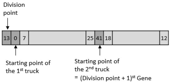 The GA generates multiple separate travel routes with one chromosome. We design and explain the chromosome with two routes, and it can be generalized to include more than two routes. Figure 2 shows this chromosome as an example. The first gene is called ‘division point,’ and it represents the length of the first vehicle route, including its departure point. In Figure 2, this point is indicated as 13, which implies that the first tour is composed of 13 nodes (including the departure point ‘0’). Because the second tour begins right after the end of the first route in the same chromosome, the departure point for the second tour is denoted as ‘41’ in Figure 2, which corresponds to the same point as ‘0’ in the first route. Even though the two departure points are shown differently (0 and 41), the number ‘41’ is represented as a dummy, and this one corresponds to the same location in our model. That means that there is only one management warehouse in a district for the maintenance and storage of extra bikes.