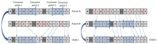 The genetic operators used to generate the next generation are as follows: Two child chromosomes are produced from the two selected parent chromosomes. Figure 3 illustrates the crossover process. Each parent chromosome has four randomly selected crossover points with two points for each path. ‘Child 1’ inherits the division point from ‘parent A’, while ‘Child 2’ takes the division point from ‘parent B’. Since the first node in both routes of a chromosome represents a dummy node indicating the same departure point, they are fixed as ‘0’ and ‘16’ in the figure (excluding the departure point, there are only 15 nodes to visit in the figure). Nodes from parent A, spanning from ‘crossover point 1’ to ‘crossover point 2’ and from ‘crossover point 3’ to ‘crossover point 4’, are inherited by ‘child 1’. The remaining nodes from ‘parent A’ are inherited by ‘child 1’ in the same order as they appear in ‘parent B’. The identical procedures apply to ‘child 2’, with ‘parent A’ replaced by ‘parent B.’