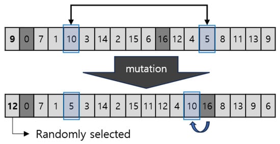 The mutation process is illustrated in Figure 4. First, the division point, indicated as ‘9’, and the first nodes (departure points) for both travel routes, indicated as ‘0’ and ‘16’, are removed. Second, two nodes are randomly selected and swapped. Finally, a division point is randomly chosen, guaranteeing that at least one third of the nodes are visited in one path, and the two departure points ‘0’ and ‘16’ are appropriately located in the chromosome. In the figure, nodes ‘10’ and ‘5’ are swapped, and node ‘10’ shifts to the next position because the corresponding location is for departure node ‘16’. During the evolutionary process, we set the crossover ratio to one-half, which implies that half of the offspring are generated through crossover operations, whereas the remaining half are produced by mutation operations.