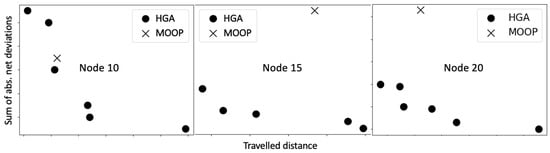 We observe that the MOOP provides only one solution to a multi-objective problem, whereas the HGA provides the Pareto frontier. Although a multi-objective approach is applied to the MOOP, it yields only one solution. Figure 5 illustrates the results of the comparison between the HGA and MOOP across three randomly selected problem sets with different numbers of nodes. In Figure 5, the HGA is represented by dots, and the MOOP is represented by crosses. As the figure shows, the MOOP produces only a single solution for each problem.