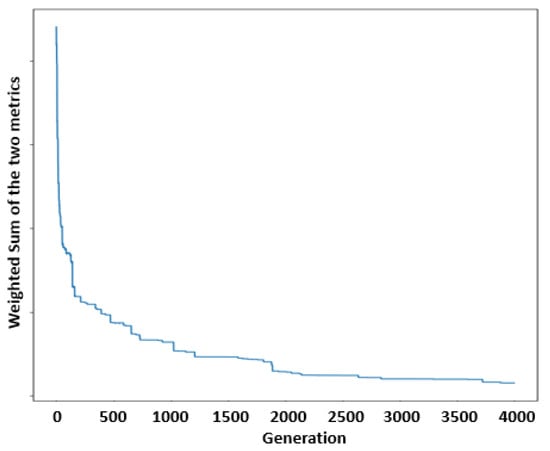 The two management vehicles must visit a total of 40 points. Therefore, terminating the HGA after only 1000 generations, as applied in the sample problem sets, is too early for the solution to converge. Figure 7 shows a preliminary run with 4000 generations. As this is a multi-objective problem, we define a weighted sum of the two objective values to represent each solution in the figure. The weighted sum is a simple method for balancing the scale between the travel distance and the sum of the absolute net deviations. Based on preliminary runs, we set the terminating condition of the HGA for this problem to 2000 generations. Although the solution continues to improve after 2000 generations, this number represents a reasonable compromise between solution quality and computation time.