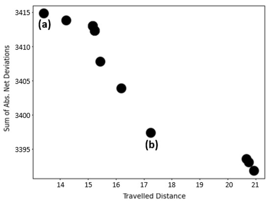 The Pareto frontiers from the HGA are displayed in Figure 8. The traveling distance (maximum distance between the two travel paths) ranges from 13.4 km to 20.9 km, and the sum of absolute net deviations (SAND) ranges from 3391 to 3415 bikes. The SAND is the sum of 40 clusters encompassing 126 bike stations. Thus, for each bike station, the net deviation is approximately 27 bikes per bike station during three hours after rebalancing work with the management vehicle that carries up to 40 bikes. The solutions from (a) to (b) are acceptable in terms of the travel path. The paths of the solutions to the right of (b) are ineffective because there is too much overlap between the travel paths of the two vehicles.