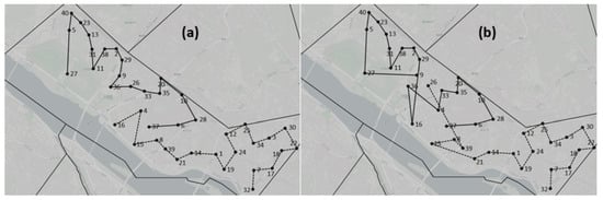 Figure 9 shows the travel paths of two management vehicles for each selected result. The left figure (marked as (a)) shows the two paths with the shortest travel distance, whereas (b) represents the smallest SAND among the effective solutions from the frontiers. As the solution changes from (a) to (b), the travel distance increases 3.83 km (13.40 km to 17.23 km), while the SAND decreases by 18 bikes (3415ea to 3397ea).
