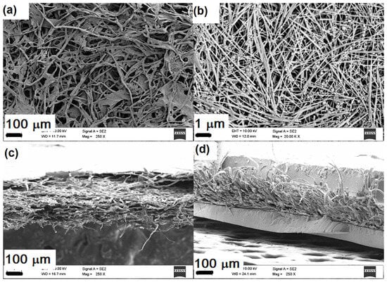 Figure 2 shows SEM images of the components used in the construction of the sensors and a cross-section of the selected item. Figure 2a illustrates the cellulose pulp sample used in the study with an average diameter of 20–50 μm. The silver nanowires applied in the study are shown in Figure 2b. The cross-section of the hybrid paper before coating with PDMS resin is depicted in Figure 2c. The average width of the structure in question is approximately 120 μm. After coating both sides with PDMS resin, the thickness of the sensor increased up to approximately 350 μm (Figure 2d).