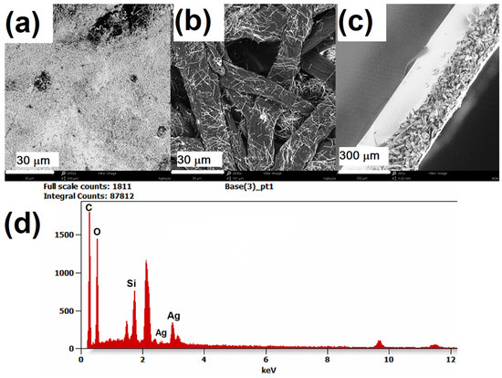 The silver nanowires used in the study are shown in Figure 2b. The average diameter of the nanomaterials was 80–120 nm, while the length varied between 10 and 30 μm. It is also possible to observe inclusions in the silver crystallites with a morphology that differs from that of the expected 1D objects. However, the practical effect of such objects on electrical conductivity, based on the authors’ observations, is negligible.