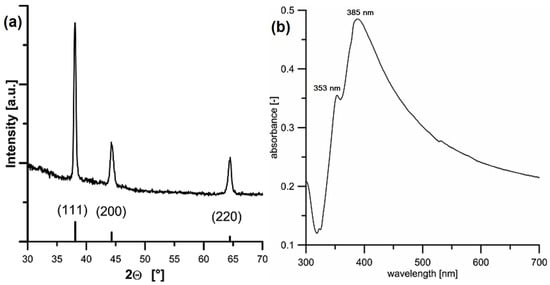 X-ray diffraction (XRD) analysis was used to evaluate the structure of the selected sample of AgNWs. Figure 5a shows a typical XRD spectrum for the manufactured AgNWs. Diffraction peaks occurring at 2Θ = 38.10, 44.25 and 64.35° are in line with the peaks which describe bulk silver (ICSD card No. 01-071-6549). They can be attributed to the crystallographic (111), (200), and (220) planes of face-centered cubic silver crystals. The observed (111) to (200) intensity of the reflexes ratio amounts to 3.7 (Figure 5a), and it surpasses the theoretical value of 2.2 (ICSD sheet No. 01-071-6549). The value indicates a significant quantity of the (111) crystal planes in the sample analyzed and a favored direction of growth of one-dimensional silver nanostructures [].