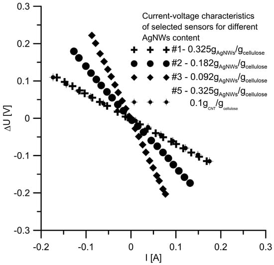 Current–voltage characteristics of AgNWs-based sensors made on hybrid paper for different conductor materials concentrations.
