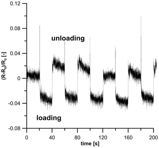 Figure 7 illustrates the response of the test system resulting from the cyclic loading and unloading of a 200 g weight onto the surface of sensor #1. After loading the weight, it remained on the sample surface for 20 s. A good representation of the forced activity waveform can be observed. The peaks observed in Figure 7 immediately after applying the weight are probably related to the dynamic deformation of the PDMS layer, which is then transferred to the hybrid paper substrate. In this situation, the hypothesis of an electro-tribological effect cannot be rejected either. However, this requires further experimental validation. After the test specimen is loaded or unloaded, a slight, progressive change in specific resistance of 0.02 is observed over time, caused by the gradual micro-deformation of the tested material. The recorded run indicates a relatively short response time duration. The problem is the results’ repeatability, especially the return to starting reference conditions after the mechanical impulse has ceased. However, this does not exclude the possibility of using the sensor in question to indicate simple mechanical impacts, especially at low rates of change.