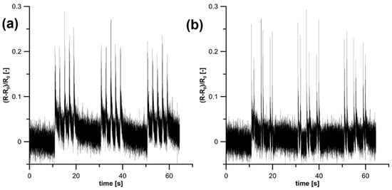 Measurements were performed at sampling frequencies of 100 and 1000 Hz, and at a supply voltage of 0.15 V. This minimized the supply’s influence on the ΔR value and ensured safety in direct contact with the sensor system.