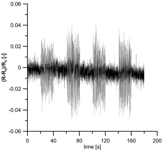 An interesting effect was observed when the neodymium magnet was cycled over the sensor surface (Figure 10). A small in magnitude but measurable change in the relative resistance of the sensor in an alternating magnetic field could be observed. It may be attributed to the generation of additional electric current within the system, which is the result of the changes in the magnetic field intensity caused by the magnet’s periodical movement. This effect is superimposed on the constant component, resulting from the flow of constant current underlying the operation of the test system. It is worth mentioning that other authors observed a similar effect of an external magnetic field on the properties of a sensor made of a magneto-rheological elastomer []. This observed phenomenon may provide a basis for the design of cost-effective and non-contact displacement sensors.