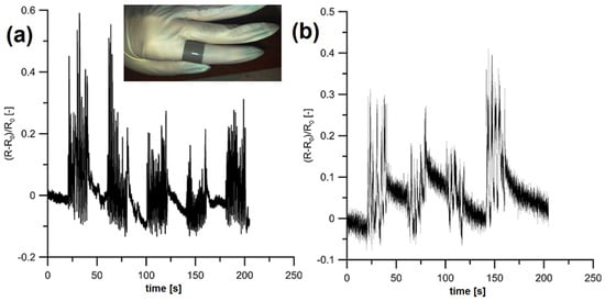 In addition to typical tests showing the possible applications of the developed sensors for inanimate physical objects, additional studies were carried out that confirmed the applicability of the hybrid paper-based sensor system for health monitoring purposes. Figure 11a illustrates using a sensor stabilized on the index finger, which was bent cyclically.