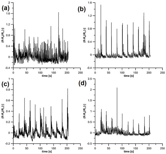 Figure 12 shows the signals measured with the sensor stabilized on the surface of the neck. In order to compare the effect achieved in the first stage, the signal was recorded in the absence of activity (Figure 12a). Random and chaotic signal runs are likely the result of electrical noise generated in the measurement system and mechanical disturbances characteristic of the sensor’s location resulting from human activity. The following runs show the response of the system to physiological actions, such as pronouncing alphabet letters aloud (Figure 12b), swallowing (Figure 12c), and head turns (Figure 12d). Some clear correlation between the activities performed and the recorded courses can be observed, which differs significantly from the previously recorded background. Furthermore, slight differences can be found between the courses obtained for the individual activities.