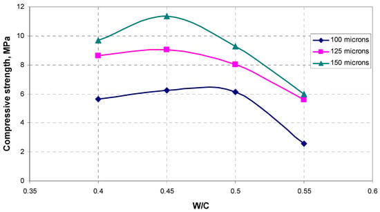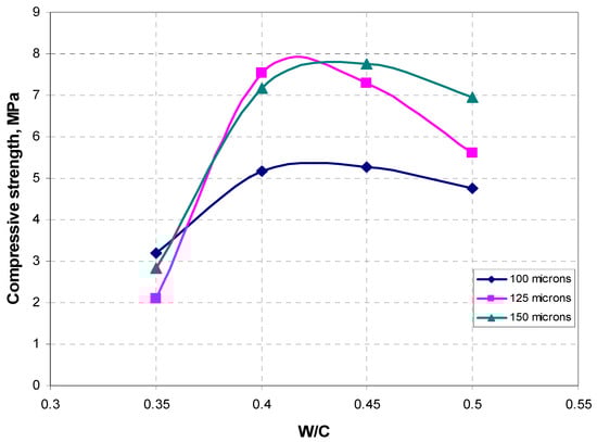 - According to Table 6, define the CPLT and the corresponding dependence of the strength on the W/C, depending on the strength required.Table 6. Dependencies of porous concrete strength on W/C at different cement paste layer thicknesses on aggregate grains.