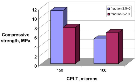 As can be seen from the shown data, when using a fraction of 2.5–5 mm with a CPLT of 150 microns, the greatest strength is obtained for W/C = 0.45. As the W/C decreases to 0.4, the strength decreases from 11.4 to 9.7 MPa. At a thickness of 125 microns, the highest strength is also achieved at a W/C of 0.45, but the difference between the strengths at W/C values of 0.4 and 0.5 is not significant. At a layer thickness of 100 microns, the strength at the values of W/C 0.45 and 0.5 is almost the same.