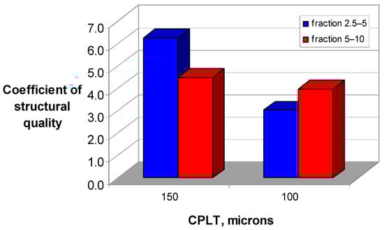 Considering the above, the better quality of the porous concrete with an aggregate fraction of 2.5–5 mm can be confirmed by the coefficient of structural quality (CSQ), which is determined by the ratio of compressive strength to the relative density of concrete. As can be seen in Figure 6, the CSQ for concrete at the 2.5–5 mm fraction is higher than for the 5–10 mm fraction. This means that despite the slightly higher density of such concrete, it has significantly higher strength, indicating a better quality of porous concrete at the 2.5–5 mm fraction.