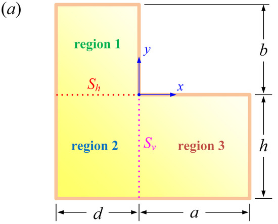In past research related to the free vibration of membranes, the geometric configurations of membranes are diverse. The homogeneous “symmetric” L-shaped membrane is notably popular among these various shapes (e.g., [24,25,26,27]). The earliest related study dates back to the 1960s, with a semi-analytical solution provided by Fox et al. [28], whose solution is often used as a benchmark for comparing other numerical methods (e.g., [29,30,31,32,33]). Apart from the works of [28,34], most solutions are numerical (e.g., [35,36,37]). As for the “asymmetric” L-shaped membranes, there are even fewer studies, with the only recent semi-analytical series solution given by Xiong et al. [38]. Unfortunately, to the best of the authors’ knowledge, no exact analytical solutions are yet available for symmetric or asymmetric L-shaped membranes.