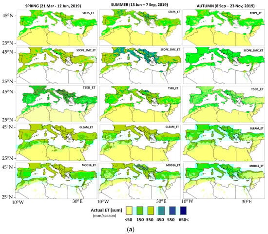 Seasonal ET sums for 2019 from each model (STEPS, SCOPE, and TSEB) are also compared with reference datasets (MOD16, GLEAM, and TerraClimate). A spatial correlation was applied to examine the degree of agreement between the models and other products. The chosen period, March to November, captures the growing season and peak ET activity. Spatial variability among ET products is most prominent in summer (Figure 3a) when atmospheric water demand is typically high in the Mediterranean region. This reflects the models’ ability to capture the spatial dynamics of ET linked to seasonal variations in water demand. As expected, ET estimates are proportionally higher in summer, ranging from 0 to 350 mm in spring, from 150 to over 650 mm in summer, and declining to 0 to 150 mm in autumn. This seasonal pattern aligns well with daily ET trends reported in many Mediterranean site-scale measurements.