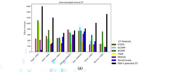(a) Total ET estimated from observed models [TSEB, SCOPE, STEPS] and reference products [GLEAM, MOD16, TerraClimate] over the Mediterranean region with their aggregated sum over major land cover types (b). Uncertainty is expected from the use of high-resolution land cover data (ESA—100 m WorldCover) for comparison.