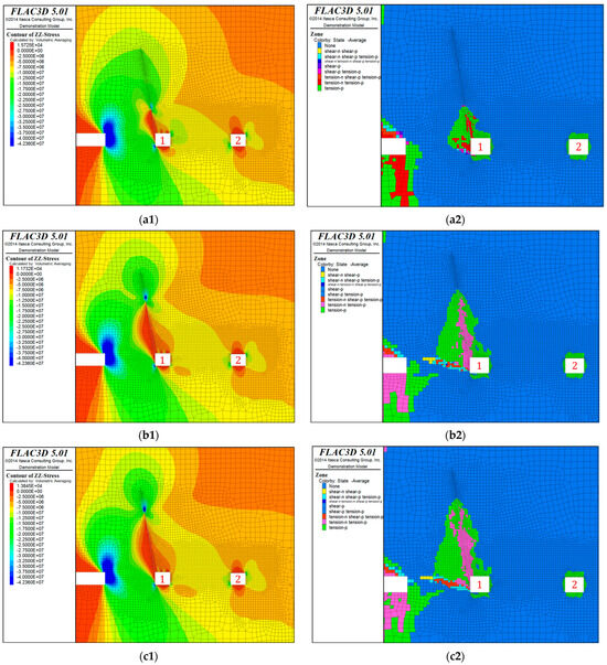 Distribution of stresses and plastic zones at different depths of roof cutting. (a1) Stress map of the surrounding rock at 13 m of roof cutting; (a2) plastic zone cloud map of the surrounding rock at 13 m after cutting the roof; (b1) stress map of the surrounding rock at 20 m of roof cutting; (b2) plastic zone cloud map of the surrounding rock at 20 m after cutting the roof; (c1) stress map of the surrounding rock at 23 m of roof cutting; (c2) plastic zone cloud map of the surrounding rock at 23 m after cutting the roof; (d1) stress map of the surrounding rock at 32 m of roof cutting; (d2) plastic zone cloud map of the surrounding rock at 32 m after cutting the roof. 1: main retracement roadway; 2: auxiliary retracement roadway.